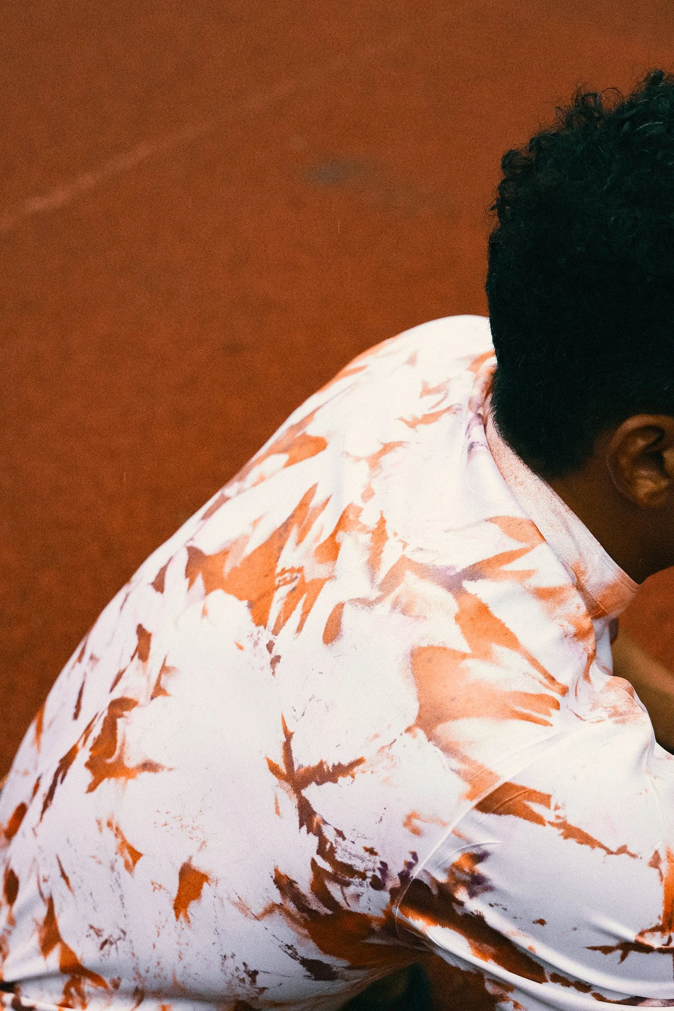 Knopfkragen mit Mandarin-inspiriertem Hochkragen. Design aus selbst gemischter Farbgebung, aufgesprüht und mittels Batik-Technik auf 100% Polyester angewandt.