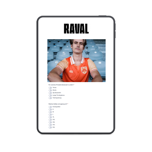 Entwickelt mit Raval Football eine einheitliche Kollektion in professioneller Qualität für euer Team oder den gesamten Verein. Shorts, Strümpfe, Sweatshirts, Schals, Sondertrikots fürs Hallenturnier und vieles mehr. Jederzeit nachbestellbar ohne Kompromisse. Bestellt bequem über euren eigene Online-Shop - und das ganz entspannt nach und nach ohne Vertragsbindung.
